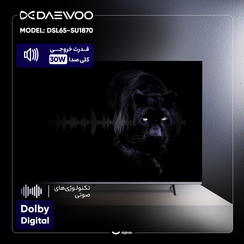 این تلویزیون همچنین از قابلیتهای ارتقای کیفیت تصویر بهره میبرد که میتواند محتوای با رزولوشن پایینتر را به کیفیتی نزدیک به 4K تبدیل کند و تجربهی تماشای محتواهای قدیمیتر را هم بهبود بخشد. اما مهمترین ویژگی این نمایشگر برای علاقهمندان به تصاویر روان و گیمرها، نرخ بهروزرسانی تصویر ۱۲۰ هرتزی آن است. این نرخ نوسازی بالا، حرکات سریع در فیلمهای اکشن، مسابقات ورزشی و بهخصوص بازیهای ویدیویی را بسیار روان، نرم و بدون تاری نمایش میدهد و تجربهای بسیار لذتبخش و واقعیتر را به ارمغان میآورد. نسبت تصویر ۱۶:۹ هم استاندارد رایج برای اکثر محتواهای ویدیویی است. تلویزیون دوو DSL-65SU1870 به یک سیستم صوتی دو کاناله مجهز است که توان خروجی کلی ۳۰ وات را ارائه میدهد. این میزان صدا، که احتمالا از ترکیب دو بلندگوی ۱۵ واتی یا ترکیبی مشابه حاصل میشود، برای پر کردن یک اتاق نشیمن بزرگ با صدایی واضح، رسا و قدرتمند کاملا کافی است. پشتیبانی از فناوری صوتی Dolby Digital، به بهبود کیفیت و تفکیک صدا کمک شایانی میکند. این تلویزیون قابلیت ایجاد صدای فراگیر و سهبعدی را هم دارد که به ایجاد حس حضور بیشتر در صحنهها و تجربهی شنیداری غنیتر کمک میکند.