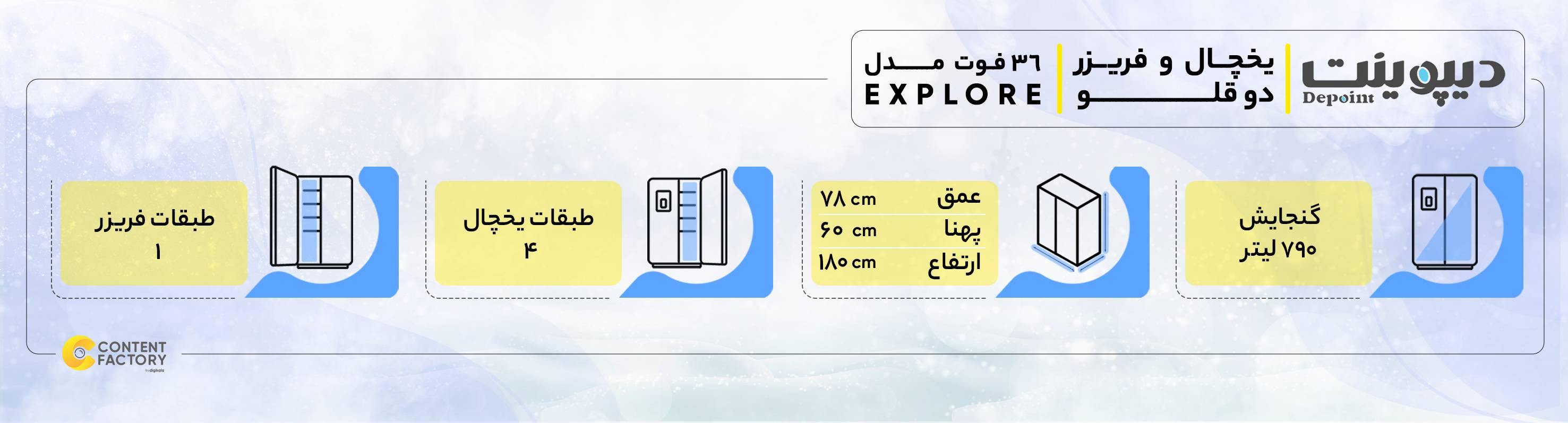 دیپوینت برند ایرانی است که کیفیت محصولات تولید شده توسط این شرکت شانه به شانه کالاهای مشابه کره ای می زند.یخچال و فریزر دوقلو explore با ظرفیت 450 لیتر برای یخچال و 340 لیتر برای فریزر، در مجموع فضای بسیار جاداری را برای ذخیره و انجماد مواد غذایی در اختیار شما میگذارد. می توان اینگونه بیان کرد که explore محصولی متناسب با خانواده های پرجمعیت یا افرادی است که حجم زیادی از مواد منجمد را نگهداری می کنند. explore دارای دو دستگاه کاملا جداست اما این دو کاملا با یکدیگر هماهنگ عمل میکنند و یک محصول را تشکیل می دهند.از مشخصه های بارز این محصول میتوان به موارد زیر اشاره نمود:1- به هیچ وجه برفک نمیزند. (NO FROST)2- مجهز به آبریز بیرونی و یخساز اتوماتیک می باشد:که باعث کاهش نیاز به باز و بسته کردن درب و در نتیجه کاهش مصرف برق می شود.3- دارای حالت انجماد سریع4-دارای محفظه نگهداری مرغ ، گوشت و سبزیجات با حفظ تازگی5- دارای 3 سنسور کنترل دما6- سیستم روشنایی LED کم مصرف