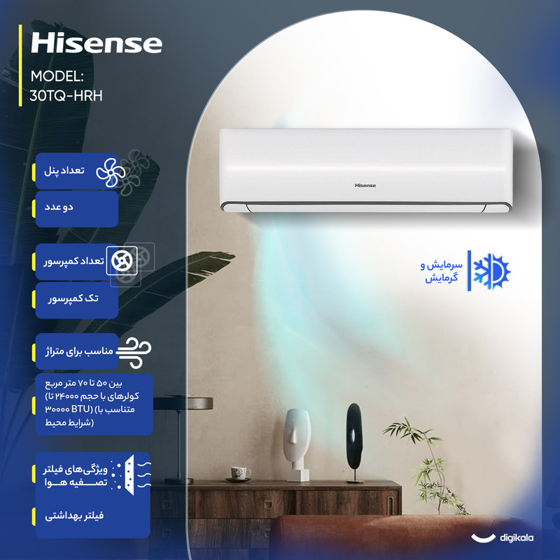 اغلب خریداران پس از خرید کولر گازی 30 هزار هایسنس مدل HRH-30TQ ابراز رضایت داشتهاند، چرا که این کولر از قدرت خنککنندگی بالا برخوردار بوده و ساخت قطعات داخلی و بیرونی آن باکیفیت انجام شده است. از جمله مشخصههای کولر گازی 30 هزار هایسنس مدل HRH-30TQ میتوان به کممصرف بودن، دور ثابت، تک پنل بودن، قابلیت نظافت آسان، طراحی زیبا و مدرن، عملکرد بدون لغزش، پرههای طلایی ضدزنگ، قابلیت نظافت آسان، کمپرسور روتاری و فیلتر پلی پروپلین قابل شستشو اشاره کرد. با استفاده از فیلتر موجود در کولر گازی 30 هزار هایسنس ذرات گرد و غبار به راحتی جذب میشود و باکتریهای آلرژیزا دیگر در محیط وجود نخواهد داشت. این محصول دارای اینورتر 300 است که همین قابلیت کمک کرده تا قدرت خنککنندگی بالایی داشته باشد. این کولر (اسپلیت) نصب بسیار آسانی دارد و به راحتی میتوان آن را روی دیوار نصب کرد. در مناطق دارای هوای معتدل و گرم میتوان به خوبی از این کولر استفاده کرد. کولر گازی 30 هزار هایسنس دارای ریموت کنترل بوده و میتوان آن را از راه دور راحت تنظیم کرد. کولر گازی 30 هزار هایسنس با چرخش 360 درجه پروانهای خود، میتواند هوا را به خوبی مکش کرده و عمل فشردهسازی آن را انجام دهد و بعد با فشار بسیار زیاد هوا را از دریچه خروجی به بیرون بفرستد. بخش بیرونی این کولر، گاز را خنک میکند، بدنهای فلزی داشته و میتوان آن را در فضای باز بر روی پایههایی خاص نصب کرد. کولر گازی 30 هزار هایسنس مجهز به فیلتر تصفیه هوا است با خرید آن میتوانید به راحتی بوی نامطبوع محیط را حذف و باکتریها را در محیط نابود کنید.
