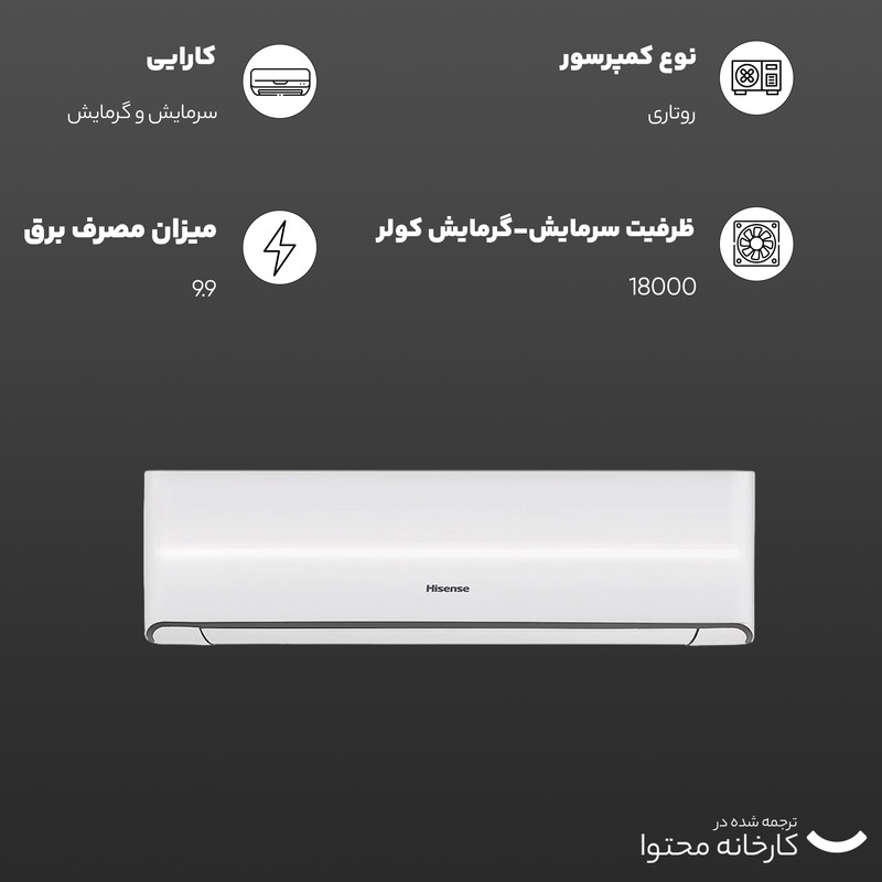 برند هایسنس به عنوان یکی از بزرگترین تولیدکنندههای لوازم خانگی دنیا با در نظر گرفتن نیاز خانوادهها به وجود سیستم تهویه مطبوع و مطلوب هوا و خنککننده در خانه برای تغییر حس و حال فضای آن به فکر طراحی و تولید کولرگازی مدل HRH-18TQ افتاد تا چشم اهالی بازار لوازم خانگی را به محصول خود خیره کند. این دستگاه به دلیل بهرهمندی از رتبه مصرف انرژی درجه A منجر به صرفهجویی قابلتوجه در مصرف برق و انرژی و همینطور کاهش هزینهها در بلندمدت میشود و خصوصا در شرایط آب و هوایی معتدل و گرم به کارتان میآید. همچنین برخورداری از یک عدد کمپرسور در کولرگازی هایسنس نیز به دلیل عملکرد قابل قبول در دمای بالا به سادگی و با تضمین امنیت استفاده از هوای پاکیزه و ساده را به جای دیگر منابع انرژی فراهم میکند. این کمپرسور گرما را از مبرد یا مایع خنک کننده هوا به کندانسور (وسیلهای که گرما را از هوا می گیرد) انتقال میدهد؛ کمپرسور مبرد را به حجم کمتری فشرده میکند و بهرهوری و کارایی انرژی آن را افزایش میدهد.