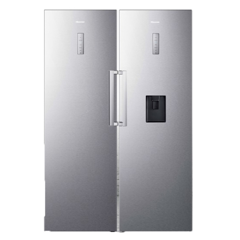 Hisense 40‑Foot Twin Refrigerator and Freezer – Model RS370S/FS270S, featuring a digital display and No-Frost system, with a height of 186 cm, width of 120 cm, and depth of 67 cm. Energy rating: A+. Equipped with 5 shelves in the refrigerator and 5 drawer