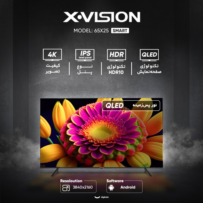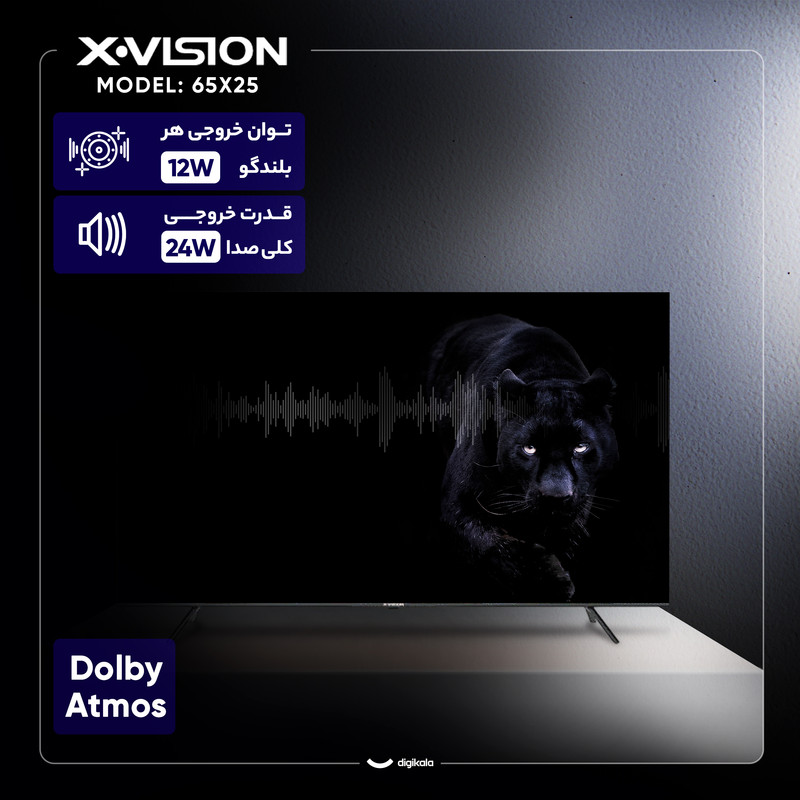 تلویزیون ۶۵ اینچ ال ای دی هوشمند ایکس ویژن مدل 65X25 با طراحی صفحه تخت و گرید انرژی B، گزینه‌ای پیشرفته برای افرادی است که ترکیبی از کیفیت تصویر بالا و امکانات هوشمند را به‌دنبال دارند. این محصول از تکنولوژی صفحه نمایش QLED بهره می‌برد که در کنار پنل IPS Level Panel، رنگ‌هایی زنده، شفافیت فوق‌العاده و زاویه دید گسترده ۱۷۶ درجه را ارائه می‌دهد. رزولوشن ۳۸۴۰×۲۱۶۰ پیکسل با نسبت تصویر ۱۶:۹ و کیفیت ۴K باعث نمایش جزئیات دقیق و واقعی می‌شود. نرخ تازه‌سازی تصویر ۶۰ هرتز، روشنایی ۳۶۰ نیت، نسبت کنتراست ۱۵۰۰ و زمان پاسخ‌دهی سریع ۸ میلی‌ثانیه تجربه‌ای روان و بدون تاری از محتوای ویدئویی را تضمین می‌کنند. همچنین پشتیبانی از فرمت‌های HDR10، نمایش محتوای دارای دامنه دینامیکی بالا را امکان‌پذیر ساخته است. بخش صدای این تلویزیون با توان خروجی کلی ۲۴ وات و فناوری پیشرفته Dolby Atmos، صدایی فراگیر، عمیق و کاملاً هماهنگ با تصویر ارائه می‌دهد. این ویژگی باعث می‌شود کاربر هنگام تماشای فیلم یا بازی حس حضور در صحنه را تجربه کند. از نظر اتصالات، تلویزیون مجهز به ۳ پورت HDMI 2.0، ۲ پورت USB 2.0، پورت شبکه LAN، جک ۳.۵ میلی‌متری صدا، ورودی آنتن و یک رابط کامپوزیت است. گیرنده دیجیتال داخلی DVB-T2 نیز امکان دریافت مستقیم کانال‌های تلویزیونی را بدون نیاز به تجهیزات جانبی فراهم می‌کند. قابلیت‌های هوشمند این مدل با سیستم‌عامل Android و حافظه داخلی ۱۶ گیگابایت شامل اتصال به اینترنت، منوی فارسی، پشتیبانی از زیرنویس فارسی، مرورگر وب، ضبط برنامه (PVR)، قابلیت Time Shift، تله‌تکست، جدول پخش برنامه و خاموش شدن خودکار است. پردازنده چهار هسته‌ای آن اجرای سریع و بی‌وقفه برنامه‌ها و بازی‌ها را تضمین می‌کند. از نظر طراحی، ابعاد دستگاه با پایه ۱۴۴۵x۹۰۲x۳۴۲ میلی‌متر و بدون پایه ۱۴۴۵x۸۳۷x۹۸ میلی‌متر است. وزن آن با پایه ۱۸.۹ کیلوگرم و بدون پایه ۱۸.۲ کیلوگرم بوده و پایه‌ها به شکل دو شاخه طراحی شده‌اند. امکان نصب روی دیوار نیز به‌منظور استفاده بهینه از فضا وجود دارد. همراه دستگاه، ریموت کنترل و دفترچه راهنما ارائه می‌شود. تلویزیون 65X25 ایکس ویژن با ترکیب تصویر درخشان، صدای قدرتمند و امکانات هوشمند کامل، انتخابی ممتاز برای تجربه سینمای خانگی و سرگرمی‌های چندرسانه‌ای محسوب می‌شود.