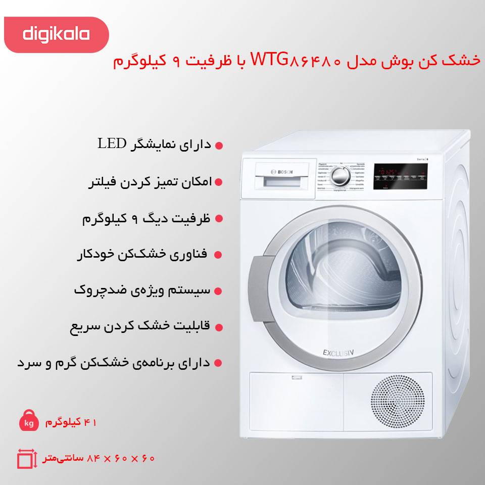 خشک کن بوش مدل WTG86480 با ظرفیت 9 کیلوگرم از دستگاه های بسیار کاربردی در زندگی امروزی است. خشک کن ها برای استفاده در آپارتمان هایی که تراس یا بالکن ندارد و افراد برای خشک کردن لباس های شسته شده فضایی جز محیط سکونت را ندارند بسیار کاربردی است. خشک کن بوش مدل WTG86480 بهتر است در کنار ماشین لباسشویی قرار گیرد. در آن به سمت راست باز شده و بارگیری در آن بسیار راحت انجام می شود. فناوری گردش هوشمند هوا در این دستگاه راندمان آن را بالا می برد و این دستگاه را در رتبه انرژی B قرار می دهد. برنامه های ویژه خشک کن بوش مدل WTG86480 شامل خشک کردن البسه به صورت مخلوط، لباس های پشمی، زمان بندی برنامه خشک کن گرم و سرد، خشک کن البسه ویژه افراد آلرژیک، لباس های ورزشی، البسه زیر، خشک کن سریع 40 دقیقه ای، خشک کن پیراهن 15 دقیقه ای می شود. استفاده از این دستگاه حتی برای کسانی که محل سکونتشان دارای بالکن هست نیز توصیه می شود چرا که از نشستن گردو خاک و دوده هوای شهرهای بزرگ روی البسه جلوگیری می شود. گفتنی است شرکت بوش (Bosch) از شرکتهای شناختهشده در تولید و عرضهی انواع محصولات و لوازم برقی بهویژه لوازم برقی خانگی است که طی سالها، با عرضهی محصولاتی که از بیشترین کیفیت و نوآوری بهره میبرند، به یکی از برترین و محبوبترین برندهای این گروه محصولات تبدیل شده است.