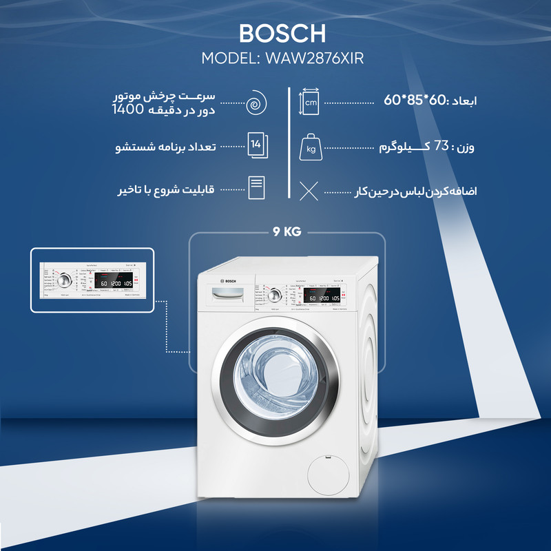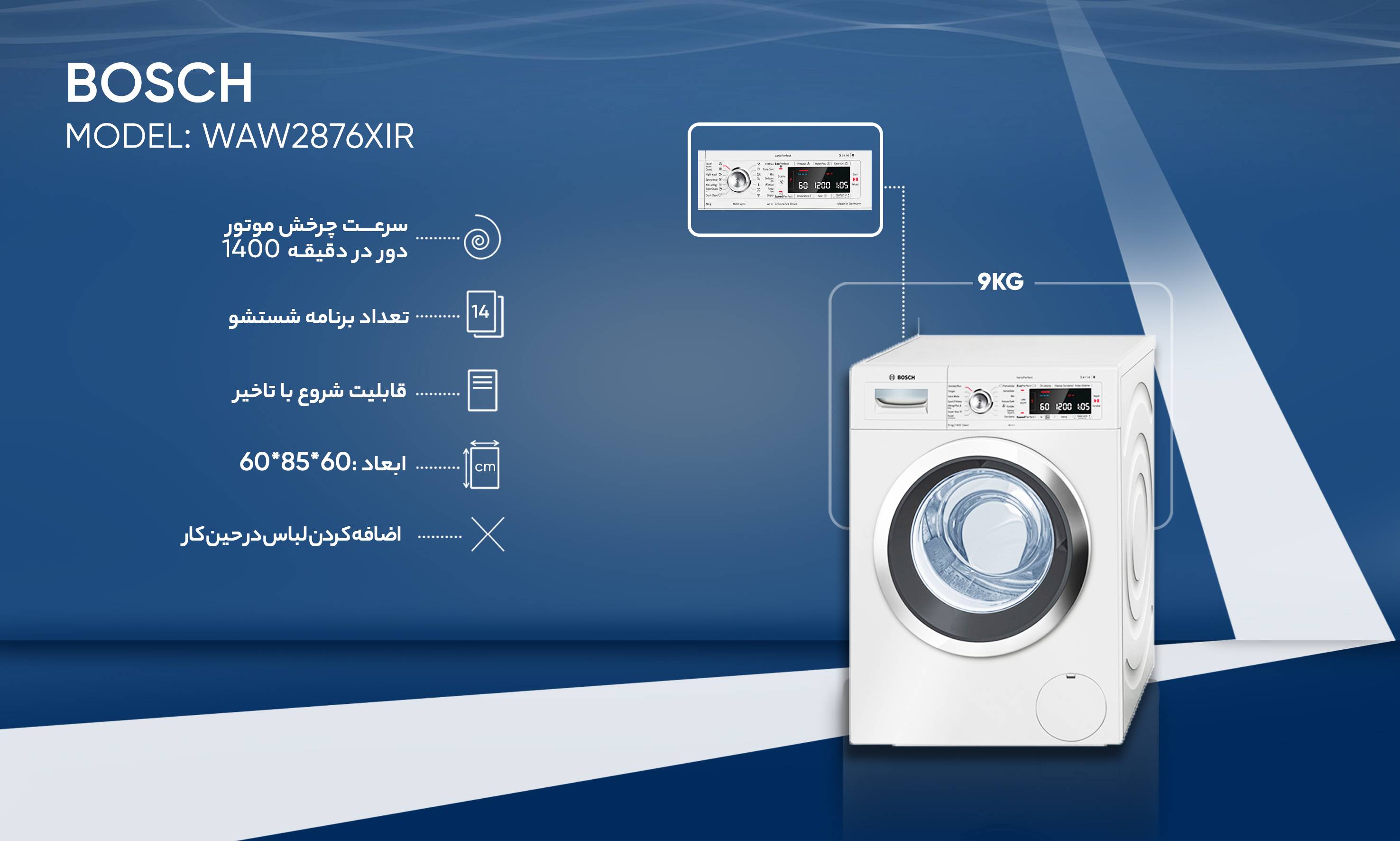 ماشین لباسشویی بوش BOSCH مدل WAW2876XIR با رده انرژی +++A جزء سری 8 لباسشویی های بوش بوده که علاوه بر کیفیتی بالا، ظاهر زیبایی نیز دارد و جلوه منحصر به فردی به آشپزخانه شما میبخشد. ظرفیت این لباسشویی 9 کیلوگرم میباشد و برای خانواده های پر جمعیت مناسب است. ویژگی منحصر به فرد لباسشویی بوش فناوری Active Oxygen بوده که 99.9% باکتری ها را بدون نیاز به مواد شوینده از بین میبرد. برنامه های شستشوی لباسشویی 2876 شامل شستشوی پیراهن و بلوز ، البسه ورزشی ، البسه تیره ، البسه کودک ، الیاف پشمی ، الیاف نخی ، شستشوی مختلط ، شستشوی شبانه ، آبکشی و چرخش و شستشوی دیگ میباشد. توسط پنل لمسی دستگاه میتوان دمای آب ، میزان چرخش موتور در دقیقه ، شروع با تاخیر و … را تنظیم نمود. سنسور تشخیص وزن البسه ، مطابق با وزن لباس ، آب مصرف می نماید و از اسراف جلوگیری میکند. در صورت باقیماندن کف نیز ، سنسور تشخیص کف شستشو را ادامه میدهد. از طریق قابلیت Vario Perfect در این لباسشویی میتوان متناسب با نوع لباس ، برنامه شستشو را انتخاب نمایید که موجب صرفه جویی 65 درصدی در زمان و 50 درصدی در مصرف انرژی میشود. در صورت فراموش نمودن افزودن لباسی برای شستشو یا بیرون آوردن لباس حین شستشو میتوانید از عملکرد توقف استفاده نمایید. طراحی خاص دیواره های لباسشویی مانع از لرزش و بروز صدای زیاد حین کار دستگاه میگردد. توسط قفل کودک تعبیه شده روی پنل میتوان از دسترسی کودکان جلوگیری نمود.
