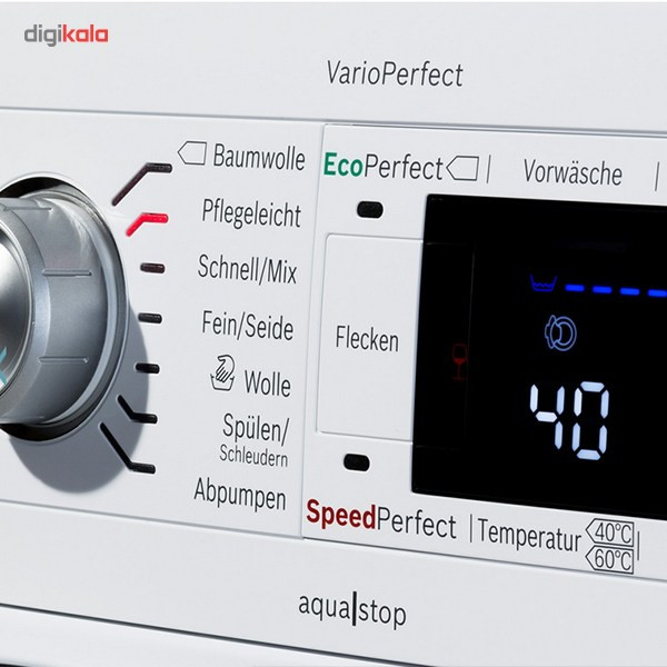| سایر توضیحات | - برچسب مصرف انرژی +++A - سیستم ضد نشت آب Aqua - قابلیت بازشدن درب تا 171 - تمیز کننده خودکار مخزن مواد - Vario Drum: شستشوی آرام و - حداکثر دور موتور: 1400 دور در - 30% پایین تر از برچسب مصرف - بدنه جدید ضد لرزش: بادوام تر و بیصدا - موتور فوق العاده بی صدا با عمر طولانی (BLDC) - سیستم Active Water: صرفه جویی در مصرف - تشخیص میزان کف / قفل کودک / صفحه نمایش - سیستم Vario Perfect: قابلیت بهینه سازی مصرف انرژی (ECO Pefect) و قابلیت کاهش مدت زمان شستشو (Speed - برنامه های صفحه کلید لمسی: انتخاب دما، تنظیم سرعت، شستشوی اولیه، ضد چروک، آبکشی اضافی، عملکرد شروع ـ توقف و ادامه برنامه، تأخیر در شروع برنامه تا 24 ساعت، 4 برنامه لکه بری - برنامه های ویژه: شستشوی ویژه پوست های حساس، پیراهن، لباس های ورزشی، شستشوی سریع 15 دقیقه ای، سریع و مخلوط، شستشو و خشک کن، شستشوی دستی ـ پشمی، ابریشمی و البسه با الیاف ظریف، شستشوی خودکار دیگ، سیستم Vario Perfect |