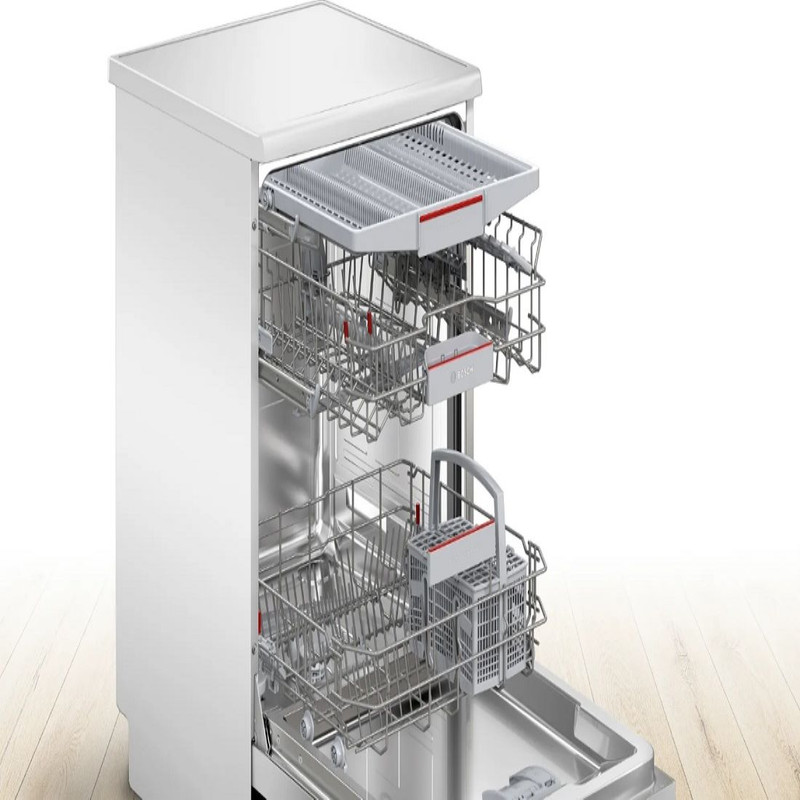 ماشین ظرفشویی بوش با باز دهی بالا و موتور قدرتمندی که دارد به همراه مصرف بهینه انرژی به نحو احسنی پاسخگوی نیازهای کاربران خود می باشد. ظرفشویی بوش مدل SMS6HMW28Q در سال 2021 توسط کشور ترکیه بار رنگ سفید و ظرفیت 14 نفره تولید و روانی بازار شد، که از جمله سری ماشین ظرفشویی های جدید و کارآمد به حساب می آید. این دستگاه فوق دارای 3 سبد مجزا و جدا از هم طراحی شده است که جزء سری6 کمپانی بوش می باشد. امکانات بی نظیر و جذایی در ساخت سری 6 به کار گرفته شده است که با این حال از رنج قیمت خوبی برخوردار می باشد. کیفیت ، کارایی و امکانات عالی ماشین ظرفشویی 14 نفره ترکیه با قیمت منصفانه ایی که دارد به راحتی در بازار توانسته خریداران و کاربران متعدی را به خود جذب نماید. قیمت مناسب موجب نشده تا از کارایی آن کاسته شود بلکه تمامی امکانات و مواردی که ظرفشویی های ایده آل دنیا دارند در ساخت این سیستم نیز تعبیه شده است . پیشنهاد ما به شما که دنبال دستگاهی با امکانات به روز و همگام با تکنولوژی های حال حاضر می باشید ظرفشویی سری 6 بوش مدل sms6hmw28q است. 3 سبدی که در قیمت بالا به آنها اشاره نمودیم هر کدام برای جا دادن نوعی ظروف می باشند. یکی از این سبدها مخصوص قاشق و چنگال می باشند و 2 سبد دیگر برای قرار دادن ظروف همانند بشقاب ، کاسه و ….. تعبیه شده اند. ظرفیت 14 نفره در نظر گرفته شده ، ظرفشویی بوش برای مهمانی های بزرگ و خانواده های پر جمعیت بسیار مناسب بوده ودیگر نیازی نیست تا چندین بار دستگاه را روشن کنیم و از آن استفاده کنیم بلکه تنها با یک دفعه روشن نمودن سیستم می توان تمامی ظرف های کثیف را به بهترین نحو ممکن شست. هنگام استفاده از دستگاه موجود اصلا نگران سرو صدای ایجاد شده نباشید زیرا به گونه ایی طراحی شده که هنگام بهره برداری صدایی بسیار کم به میزان 40 دسی بل را تولید می کند که به هیچ عنوان موجب ایجاد سرو صدا اذیت و آزار شما نمی شود. صدا آنقدر کم است که به جرات می توان گفت دستگاهی بی صدایی می باشد. برند بوش همواره در ساخت ماشین ظرفشویی های خود دیواره و بدنه را عایق نموده و از موتور پیشرفته و امروزه بدون صدای Eco Silence استفاده می کند،که در کنار توان و قدرت بالایی که دارد و اصطحکاک کمی که دارا می باشند از صدایی بسیار کم نیز برخوردار است.